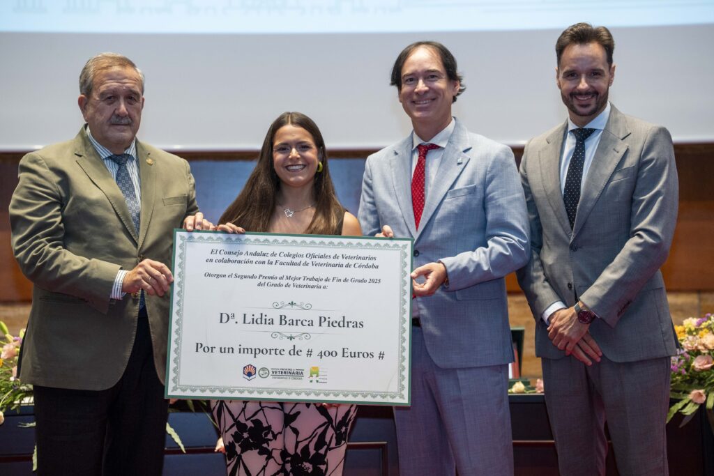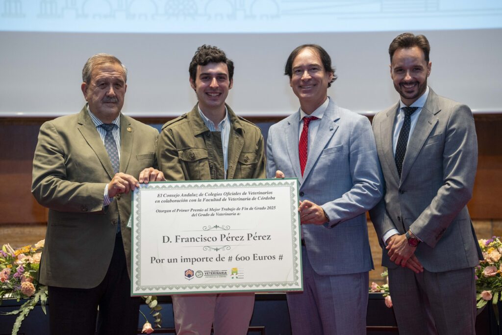 De Luque, en representación del Consejo Andaluz de Colegios Oficiales Veterinarios como consejero del mismo, hizo entrega de los premios al mejor trabajo de Fin de Grado 2025 del Grado de Veterinaria junto al decano de la Facultad de Veterinaria de la Universidad de Córdoba, Manuel Hidalgo y el presidente del Colegio de Veterinarios de Córdoba, José María de Torres.