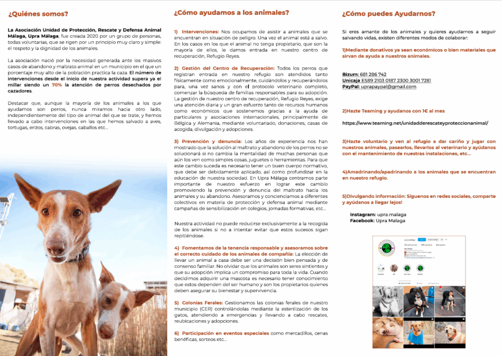 La Unidad de Protección, Rescate y Defensa Animal, UPRA Málaga fue creada en el año 2020 por un grupo de personas voluntarias regidas todas ellas por el principio del respeto y la dignidad de los animales. El número de intervenciones, desde el inicio de su primera actividad, supera ya el millar siendo ya un 70% la atención a perros.