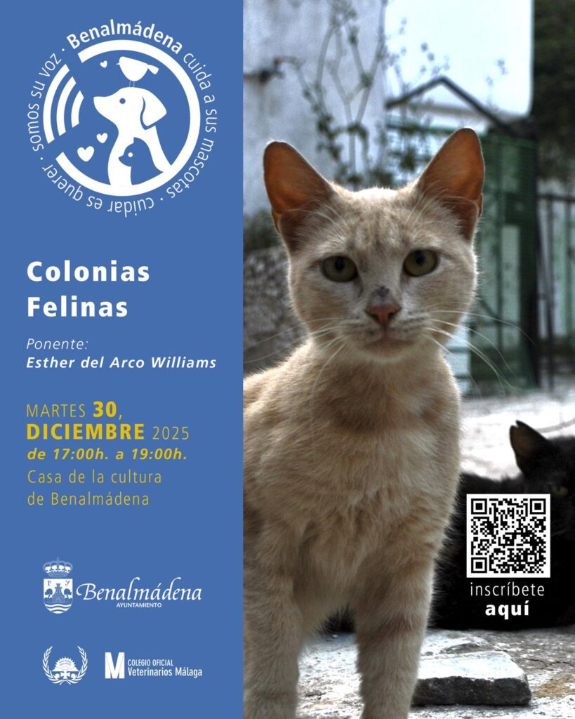 Bajo el título “Colonias felinas”, esta segunda ponencia se celebrará el martes 30 de diciembre, en horario de 17:00 a 19:00 horas, en la Casa de la Cultura de Benalmádena, y estará impartida por la veterinaria Esther del Arco Williams.