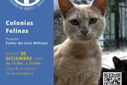 Bajo el título “Colonias felinas”, esta segunda ponencia se celebrará el martes 30 de diciembre, en horario de 17:00 a 19:00 horas, en la Casa de la Cultura de Benalmádena, y estará impartida por la veterinaria Esther del Arco Williams.