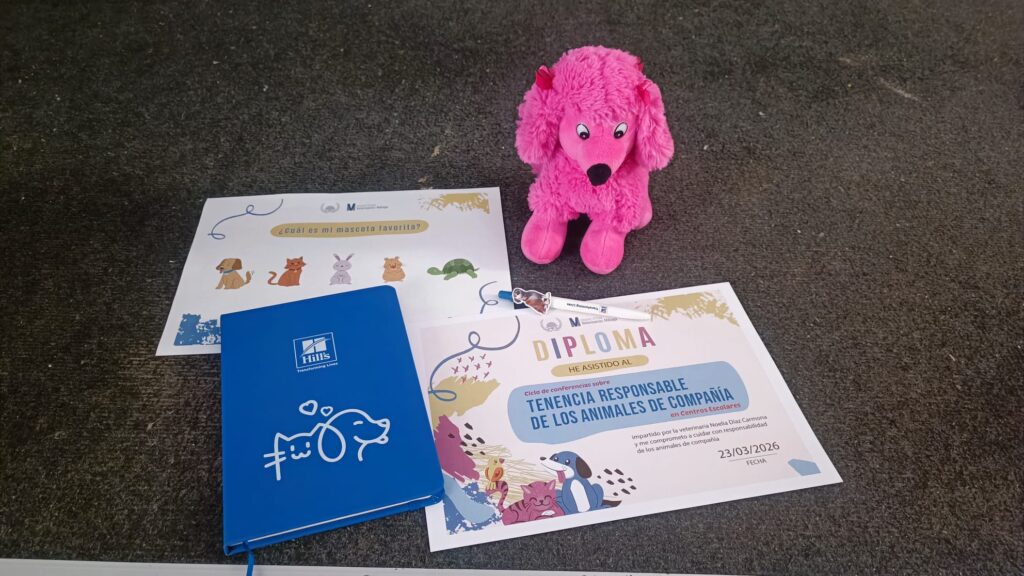 Además, se repartieron materiales educativos y detalles para los alumnos del CEE Dulce Nombre de María, como libretas, bolígrafos y unos pequeños obsequios de peluches de animales gracias a la aportación de Hill’s Pet Nutrition, que quiso colaborar de manera altruista con el Colegio de Veterinarios y con el CEE Dulce Nombre.