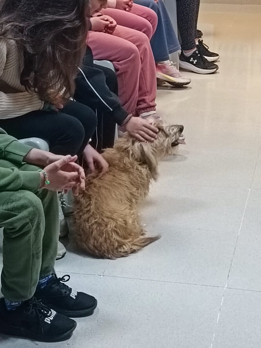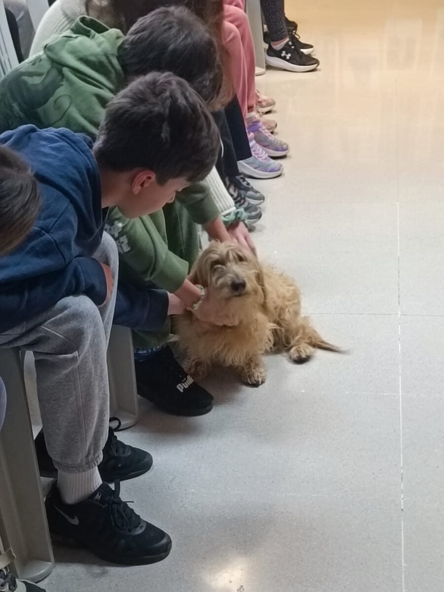La perrita Gin acompañó a Esther del Arco durante su ponencia, dejándose querer por los alumnos del CEIP Campoamor