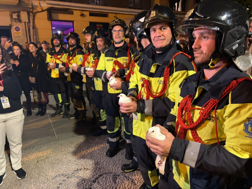 El cuerpo de bomberos de la comunidad autónoma de Madrid en la suelta de palomas del Miércoles Santo en Málaga