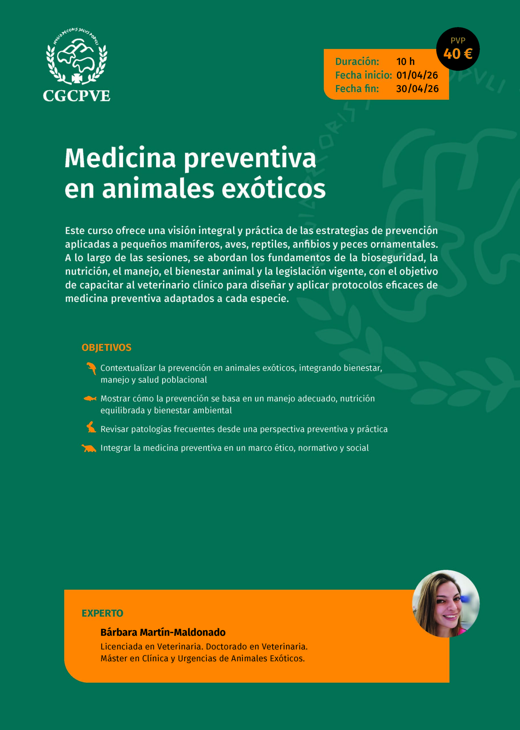 Precio: Este curso, cuyas plazas son limitadas, está dirigido sólo a veterinarios colegiados y, para poder acceder al mismo, los interesados han de realizar obligatoriamente una inscripción previa, cuyo coste será de 40 euros. Si no puedes asistir, se ha de anular la inscripción con antelación a través de la Ventanilla Única del CACV para que la plaza pueda ser ocupada por otro compañero.
